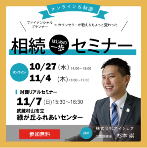 この記事のタイトルとURLをコピーする 相続というと「お金持ちの人のこと」と思いがちですが、実は誰にでも身近な問題です。 親子間はもちろん、夫婦間でもお金の話はしづらいもの 借金を知らずに相続し、自己破産したというケースも少なくありません。 「ほんとに自分に関係あるの?」「親に話しづらい」「子どもに任せるのは心配」「よくわからない」 そんな方に向けて最も大切なポイントをお伝えする「相続のはじめの一歩」をお伝えするセミナーです。 詳細・お申込みはこちら この記事のタイトルとURLをコピーする 【リアルセミナーin武蔵村山】11/7 相続ワンポイントセミナー 次の記事